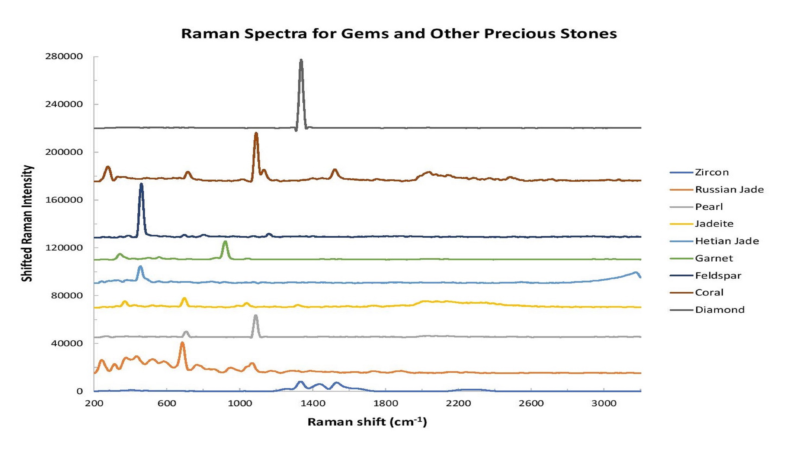 图1:拉曼光谱是宝石分析的极好工具。在这张图中,强度已经改变,以便于比较光谱形状的差异。
