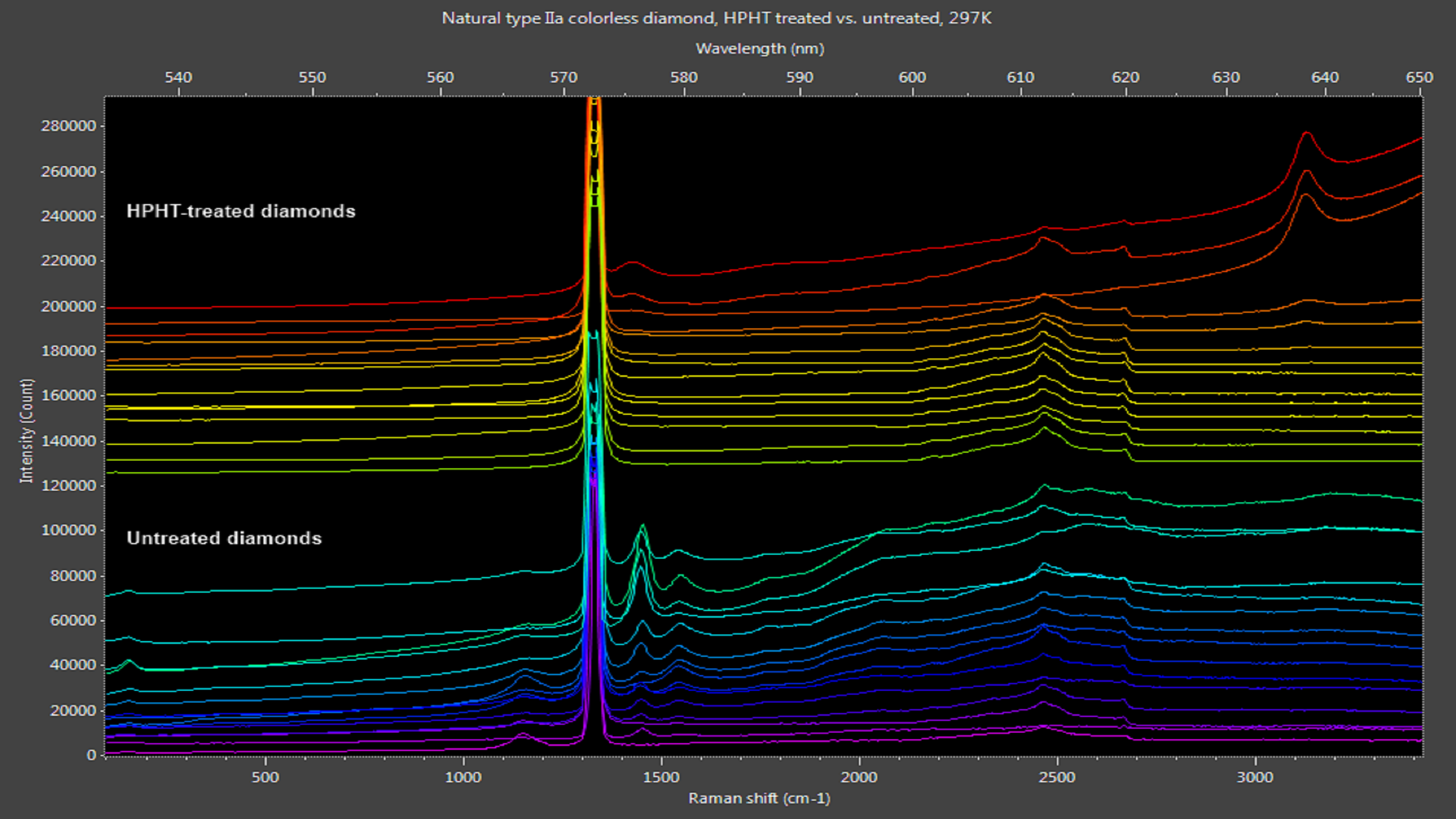 图2:天然透明钻石显示530-600 nm的光致发光峰。HPHT处理去除了大部分这些峰,在一些样品中仅留下576 nm和637 nm处的氮空位峰。