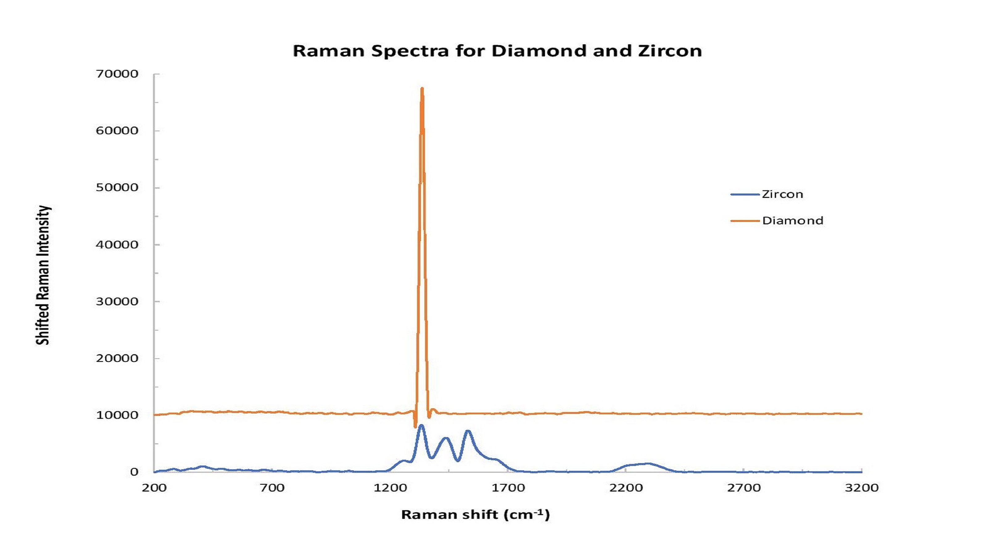 锆石是另一种天然宝石,可以加热使其无色,更像钻石。(锆石不应与立方氧化锆混淆,立方氧化锆是一种廉价的合成宝石,作为钻石模拟物非常受欢迎。)锆石和钻石的拉曼分析可用于揭示各自的不同光谱特征(图3)。