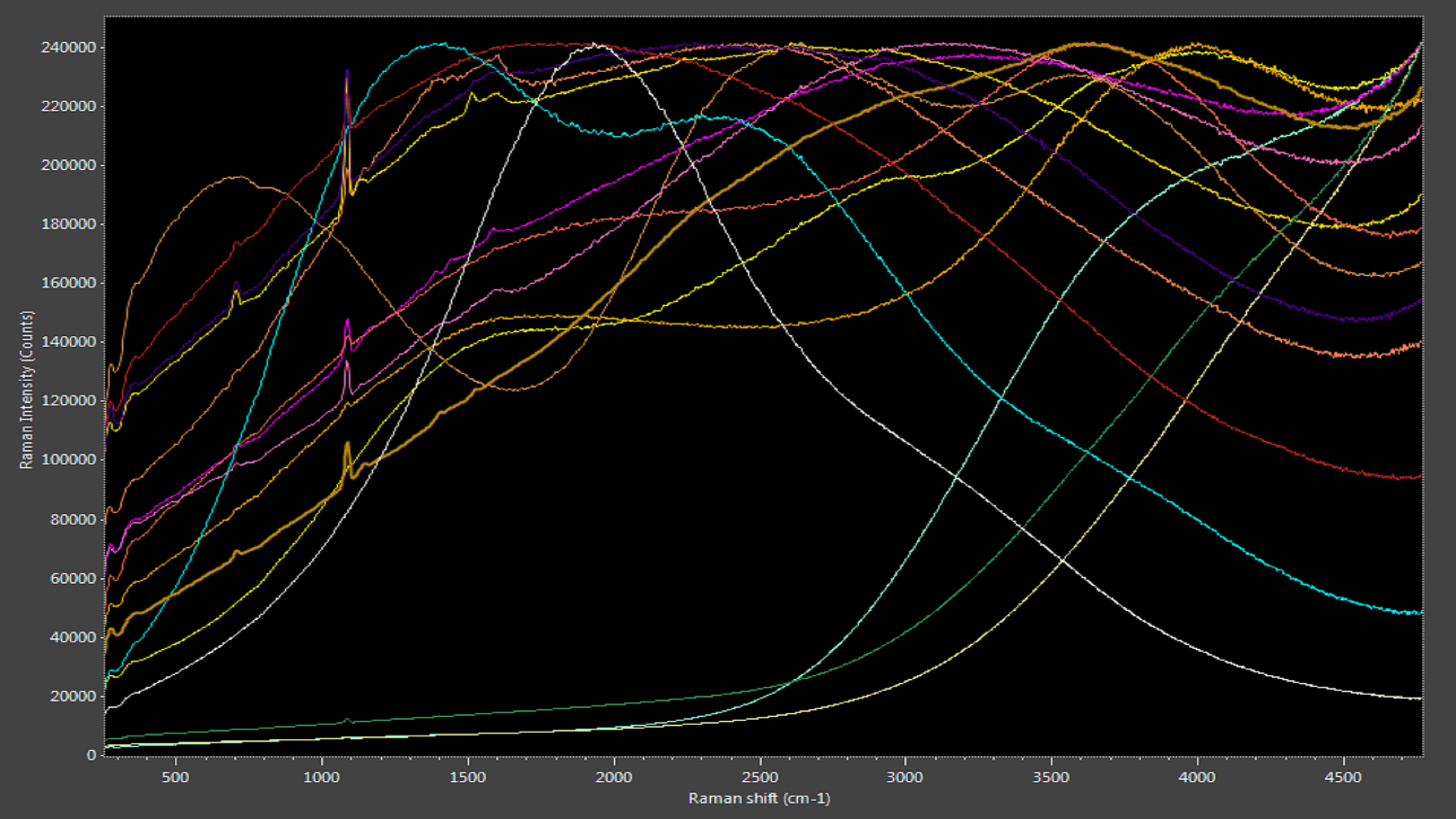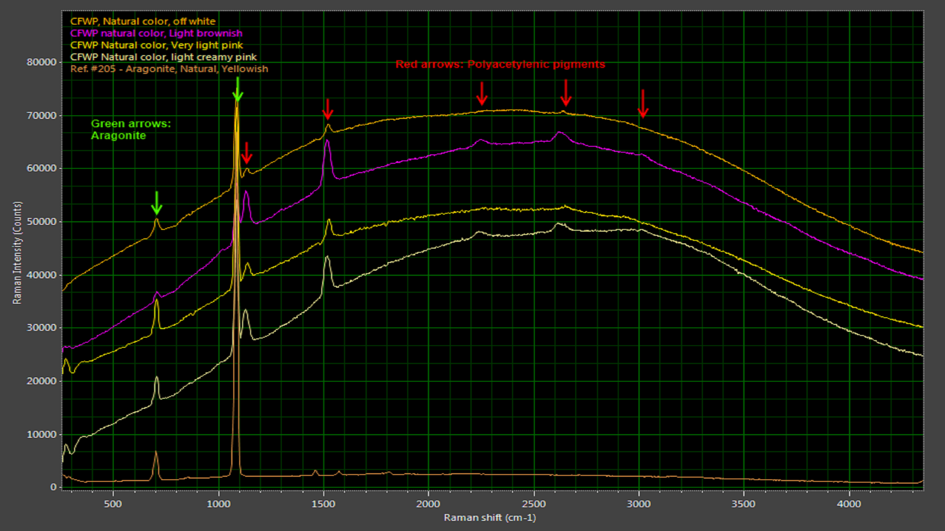 淡水养殖珍珠在其自然状态下有一个宽阔的、形状一致的发光峰,被文石(碳酸钙的一种形式)和多烯化合物引起的拉曼峰所中断(图5)。可以表现出各种发光曲线由于染色剂(图6)。虽然不能确定染色剂,photoluminescence-enhanced喇曼光谱学使它非常容易识别缺乏或染料的存在,从而验证养殖淡水珍珠的价值。