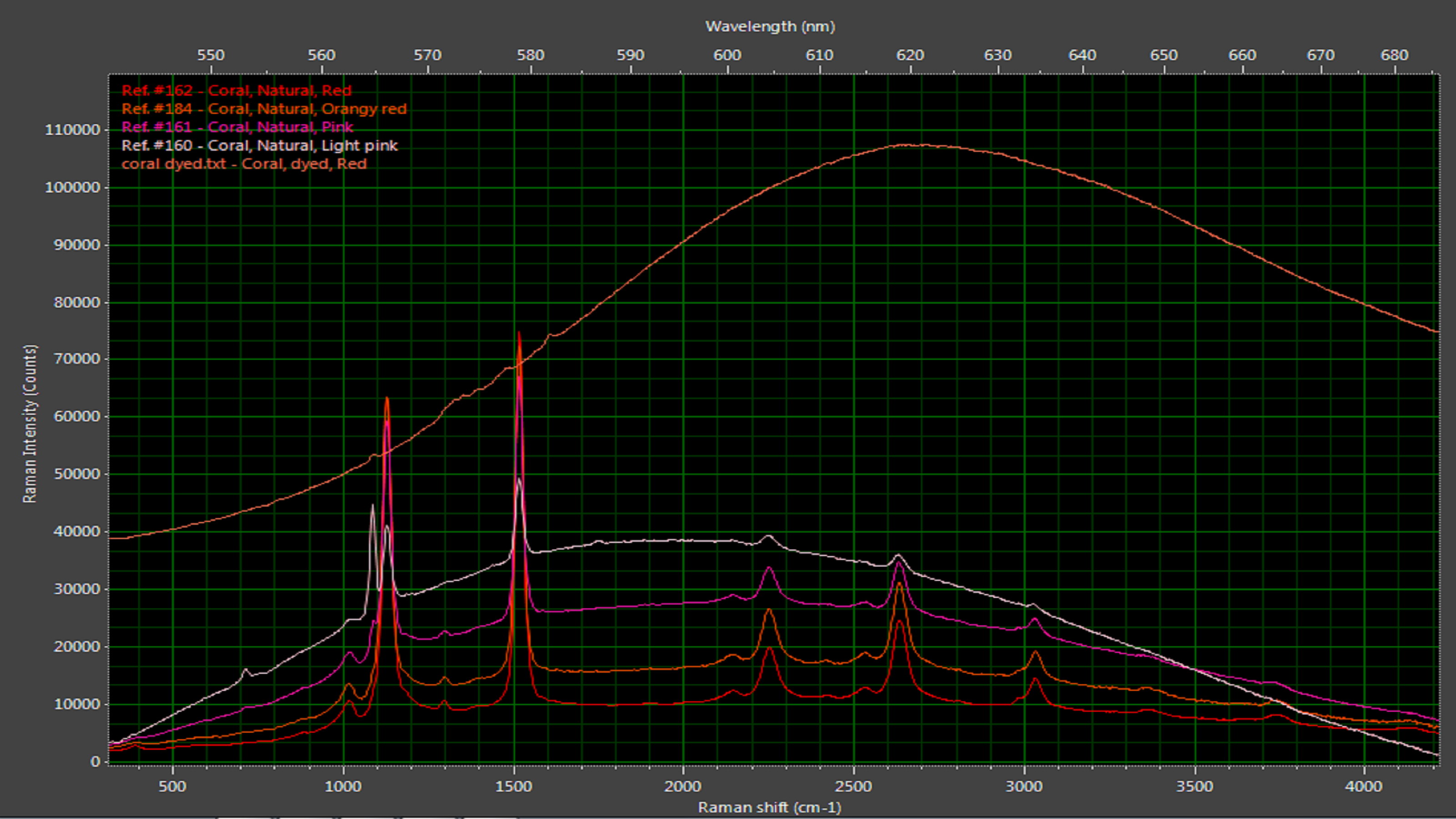 图7:染色后的珊瑚显示出较宽的发光曲线,而与自然珊瑚相关的更明显的拉曼峰。