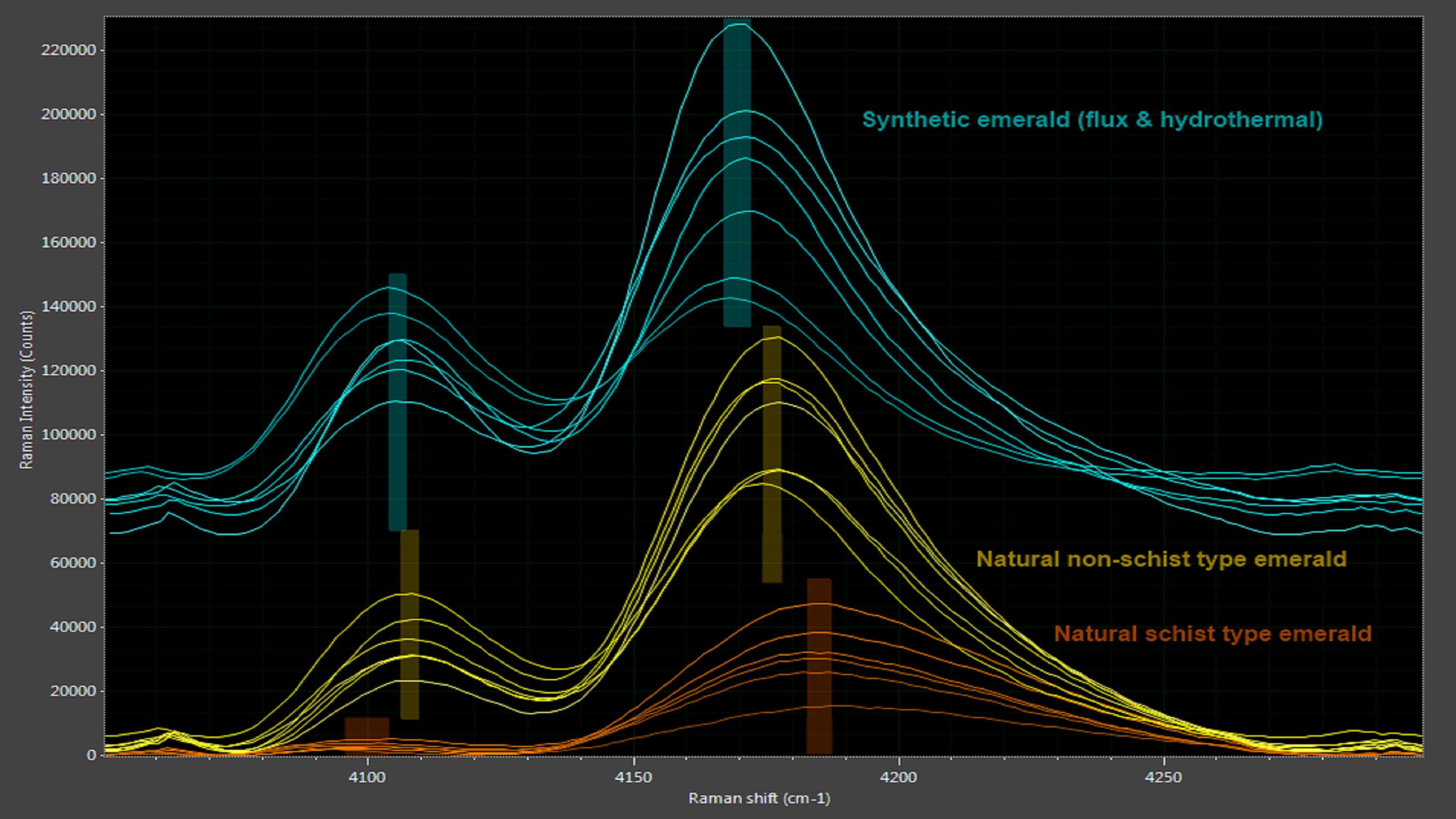 图8:光谱分析揭示了纯正祖母绿和人造祖母绿之间的细微差异。