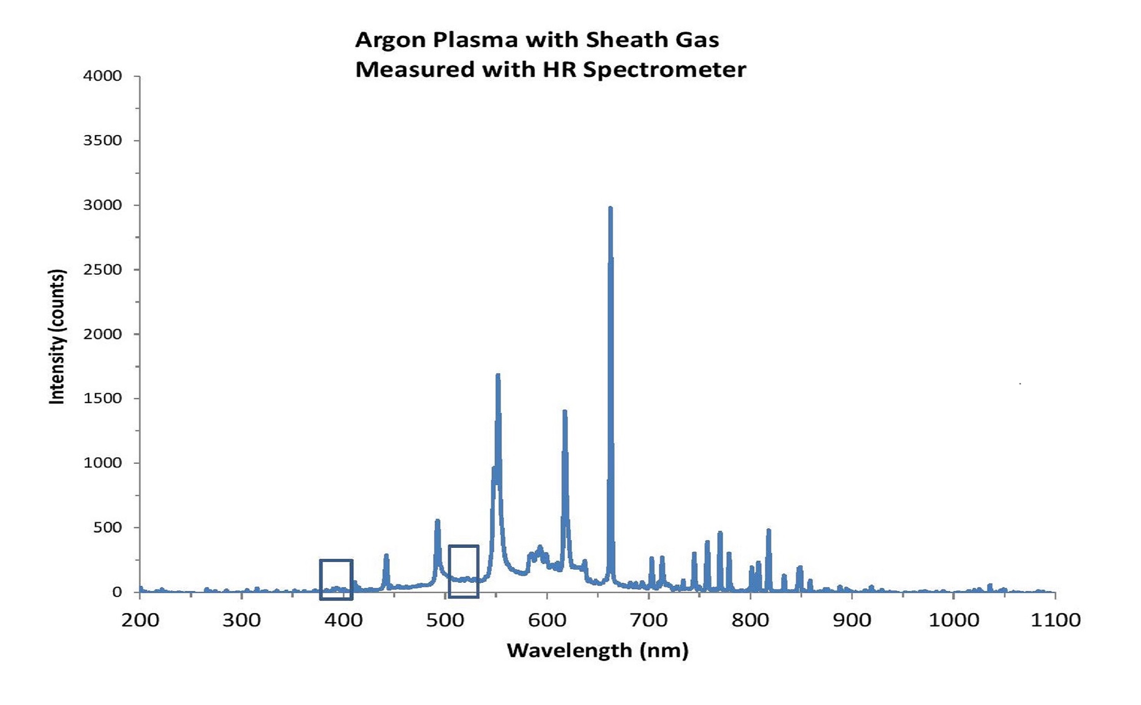 In Figures 4-5, emission spectra measured for the plasma before and after the addition of sheath gas to the chamber are shown. Sheath gas is used to decrease contact between the sample injector and the sample to reduce problems due to sample deposition and carryover. In Figure 4, the argon plasma emission spectrum is shown before the addition of sheath gas. The emission spectrum measured after sheath gas addition is shown in Figure 5. The addition of sheath gas leads to changes in the argon emission spectrum as seen in the loss of the broad spectral lines just below 400 nm and at ~520 nm.
