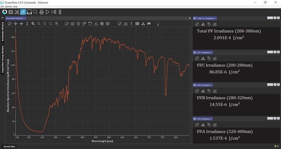 OceanView提供超过指定波长范围的能量值,μ焦耳/厘米2、µ焦耳µ瓦/厘米2和µ瓦特。但是,如果需要,原理图定制可以使您将这些单元转换为其他值。