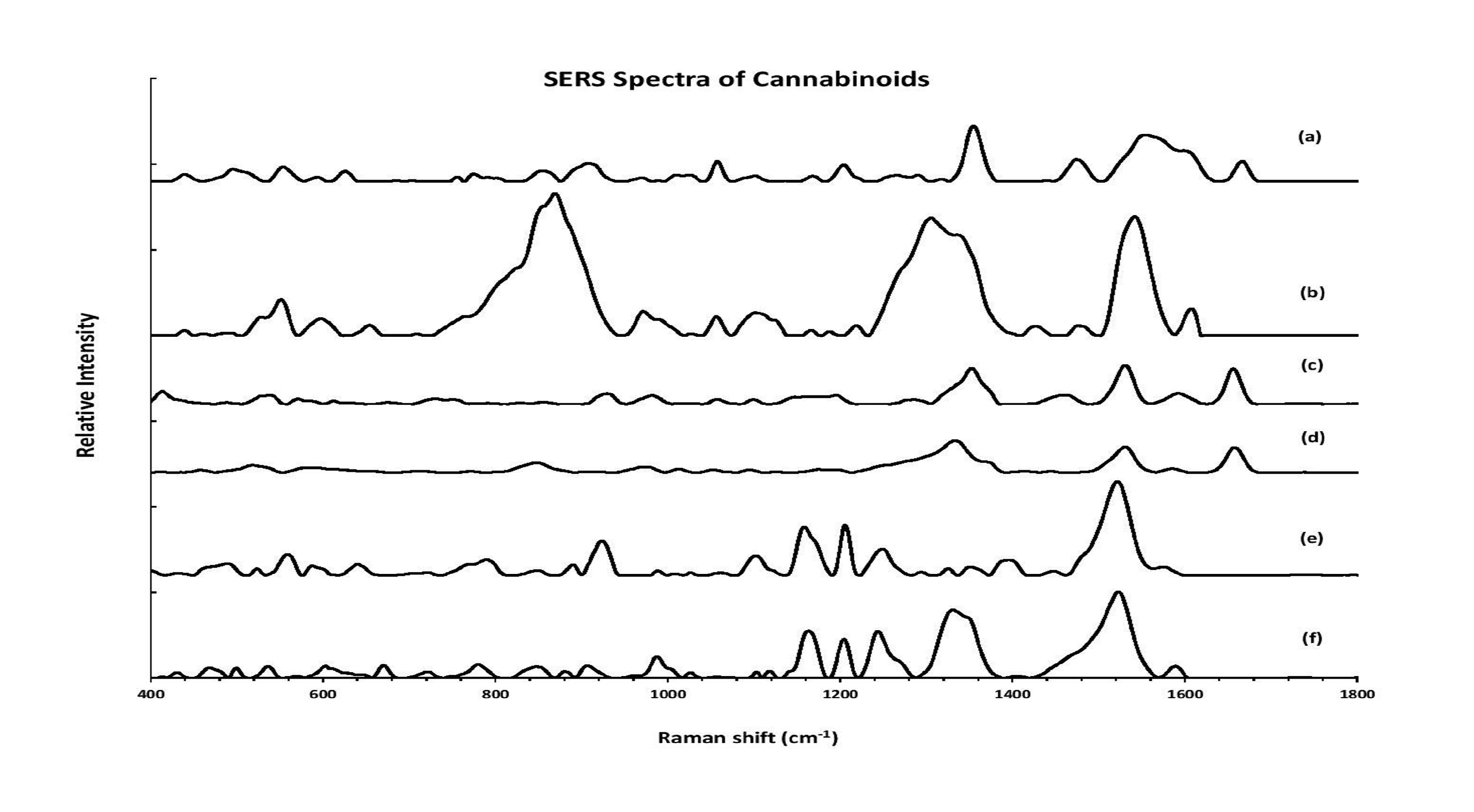 图1:10ppm(a)cbda,(b)cbd,(c)cbga,(d)cbg,(e)thca和(f)thc的sers光谱。