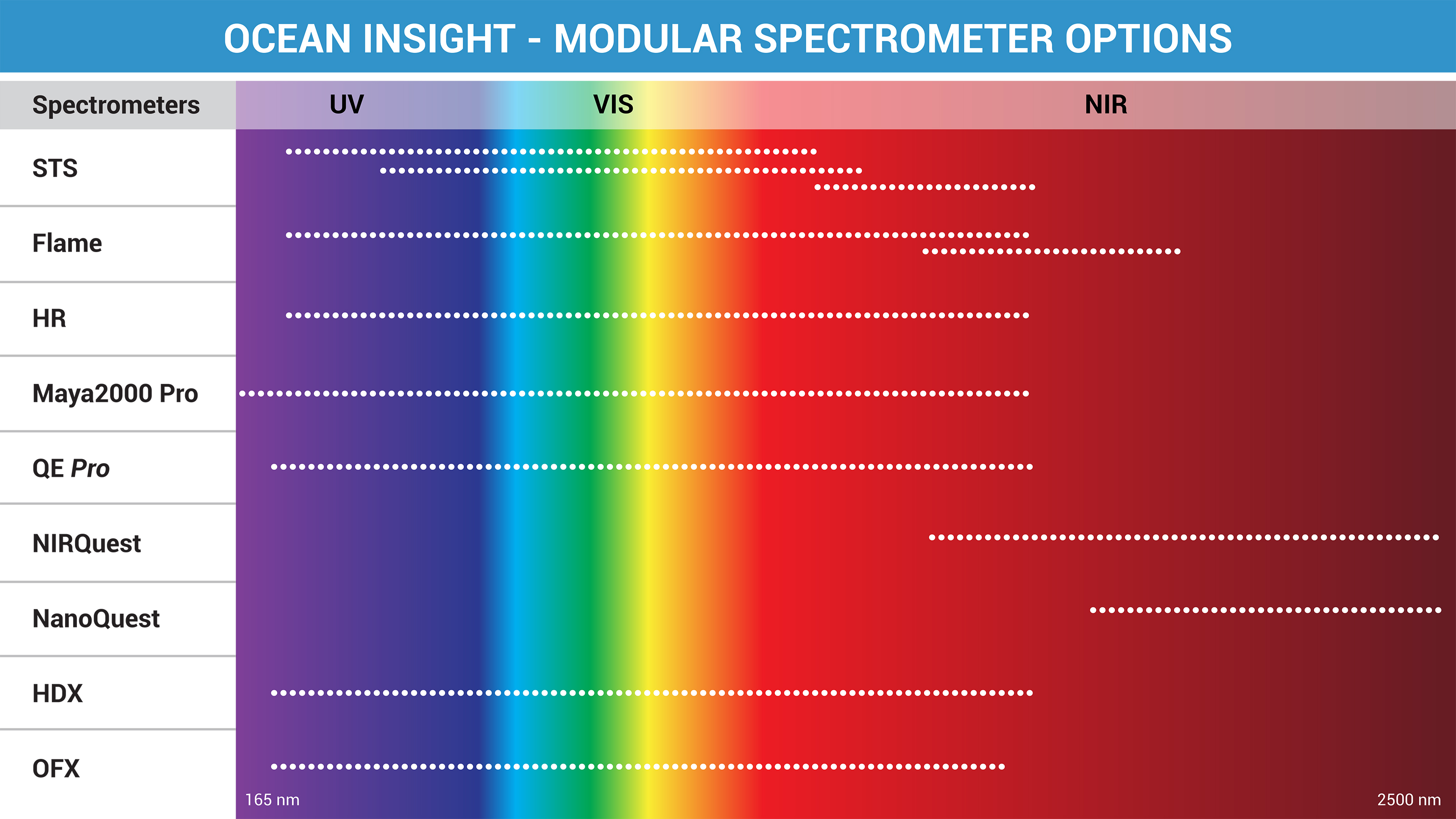 Note:Our newest spectrometer - the Ocean SR2 - is not shown on this chart. Ocean SR2 configurations are available within the 185-1100 nm wavelength range.